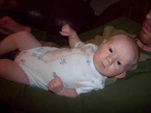 My boys are growing so fast! Eli is 10 weeks old today! He is smiling, cooing and even trying to laugh! It’s the most precious thing. Two nights ago he rolled over from tummy to back… not really on purpose, but he still did it! He’s also really beginning to notice his hands. He stares at them when he catches a glimpse like, “What are those things and how do I make them move??” He’s also gotten them to his mouth a few times to chew on! The dairy elimination worked wonders! He is much more content just because he feels so much better! I’ve been dairy free for almost 5 weeks now. Here is a picture from this afternoon, hanging out with Daddy: