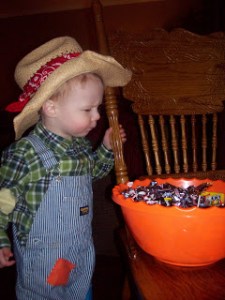 After there visit we went to stay with Mimi and Grandaddy because we had planned on being in town for Halloween night. Sometimes, living an hour away with 2 little ones, it’s just easier to stay the whole day (or night!). Luke dressed up like a scarecrow.. or farmer.. or just a cute little boy in overalls (whatever you’d like to call it!) for Halloween. He wouldn’t let us stuff him or put any kind of ‘paint’ on his face but he was super cute! Eli didn’t dress up but did have a cute Halloween outfit on. Here is Luke checking out the candy at Mimi’s: