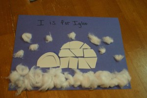 Next, I cut out an igloo from white foam and then made it into a puzzle for Luke to piece together. It was actually harder than it looks! We used cotton balls for the snow and snow flakes!