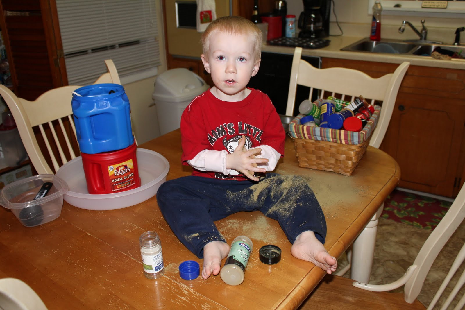 (That, by the way, is a whole bottle of sage and a brand new bottle of basil!! He had been ‘playing’ with some tupperware… I guess he decided he wanted to cook too!)