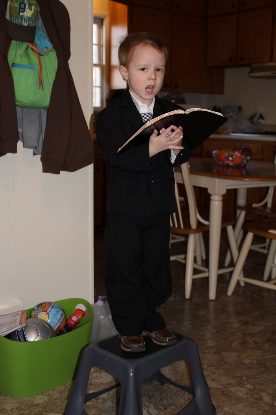 Next, Luke asked me if he could dress up in his suit he wore for Aunt Kelsey’s wedding. He said he was going to play preacher. Then he got a stool and preached to me! 🙂