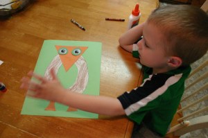 Luke made an owl out of a letter O. We got the idea from No Time for Flash Cards and we watched this video. It’s an animated video and reading of the book Owl Babies by Martin Waddell.