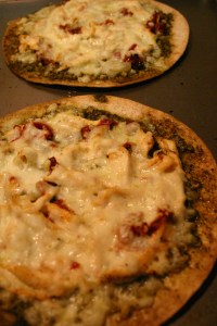 Preheat oven to 400. Cook chicken in butter (or olive oil) with a little salt and pepper and cook through. Remove chicken and saute onions in pan with chicken drippings for about 5 minutes. While onions are cooking, place tortillas onto cookie sheet (can brush pan with a little olive oil, I didn’t) and spread a thin layer, about 2 TBS, of pesto onto each tortilla leaving about an inch around the outside of the tortilla. When onions are cooked, mix onions, tomatoes, and chicken (I shredded mine further) together and top evenly on each tortilla. Top each pizza with cheese. Bake at 400 for 10 minutes or until edges are crisp and turning brown.