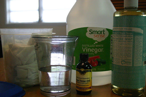 To mix mine up, I used a cup of water. I added about a tsp castile soap, 1/8 tsp tea tree oil and 1/4 cup vinegar. I think this was a pretty good amount, though I might go easier on the soap and tea tree oil (literally just 3-4 drops) and add a 1/2 cup of vinegar. I think that might help with the spots too. I’ll try to update on my next batch. It took me a whole maybe 5 minutes and that includes cutting up the t-shirt!