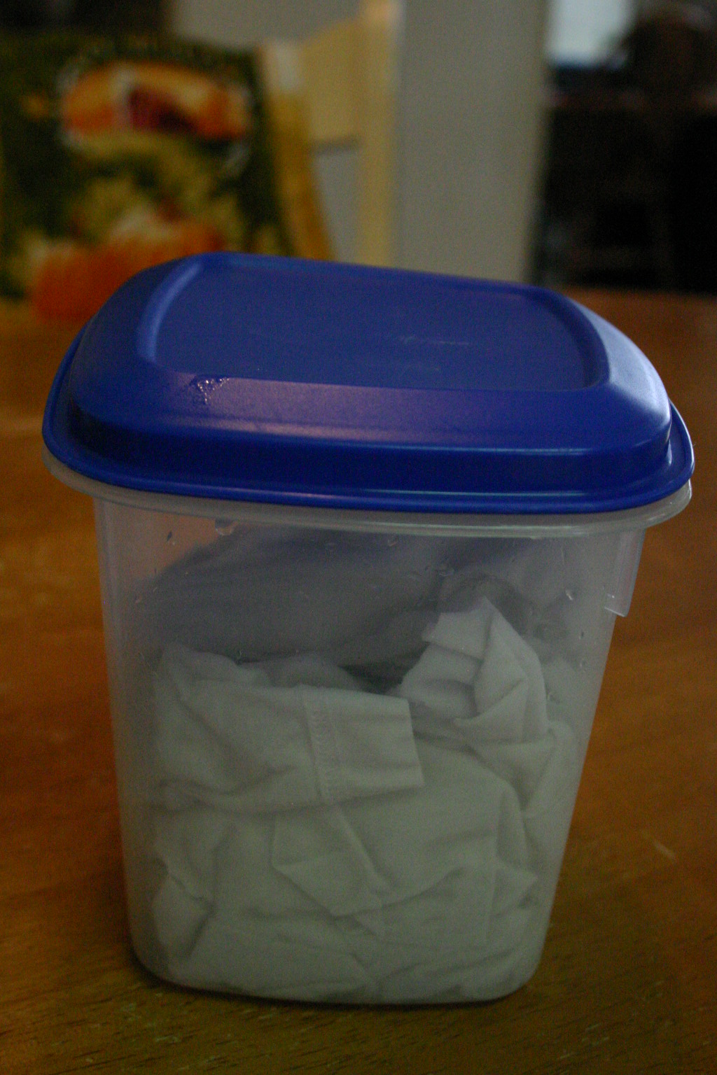 (This picture annoys me… because you can tell the lid isn’t closed all the way. As you can also tell, I didn’t fold them up fancy. I just dumped them in. Works for me!)