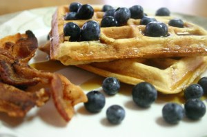 These waffles are rich (a stick of butter and 1/2 cup of sour cream, which by the way are good for you), so we all typically eat less of these than pancakes! I usually serve these with real maple syrup and fruit. And if we’re blessed to have yummy nitrate free bacon, we’ll have that as well! My boys love them cut into waffle sticks for dipping!