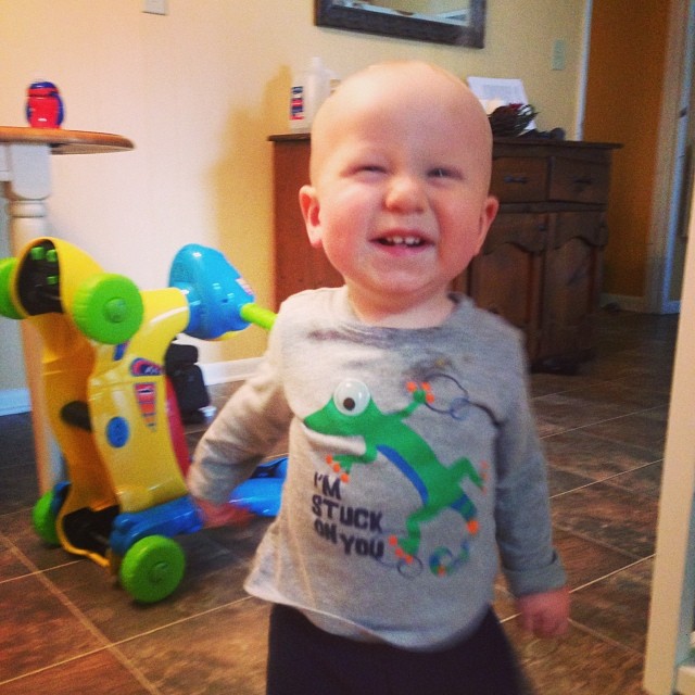 Jude has a total of 6 teeth now. He has two on the bottom and four on the top. At his yearly check up he weighed 23 lbs and 5 oz! His weight gain has slowed down, as expected, now that he is walking. Luke was around 22 lbs at a year, so I’m still expecting Jude to slim down and become one of my skinny little boys! He still, as you can see, has pretty much no hair! I love my little baldy though. He has the most perfect little head. Although, he’s right at the table height, so he seems to always have red marks all over from bumping into it!